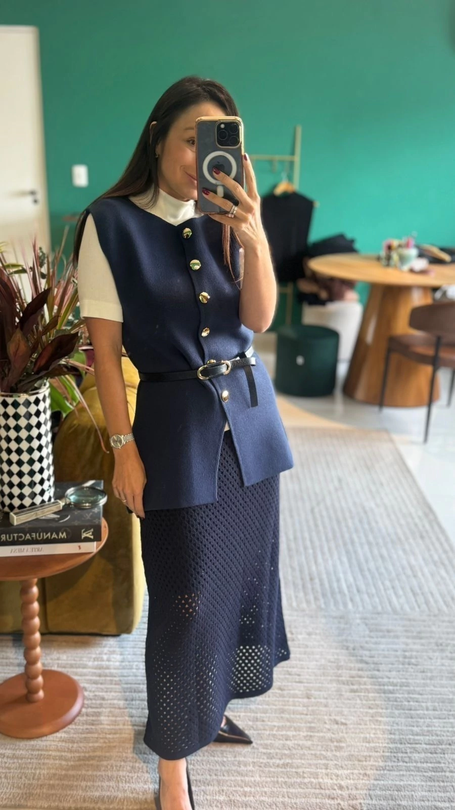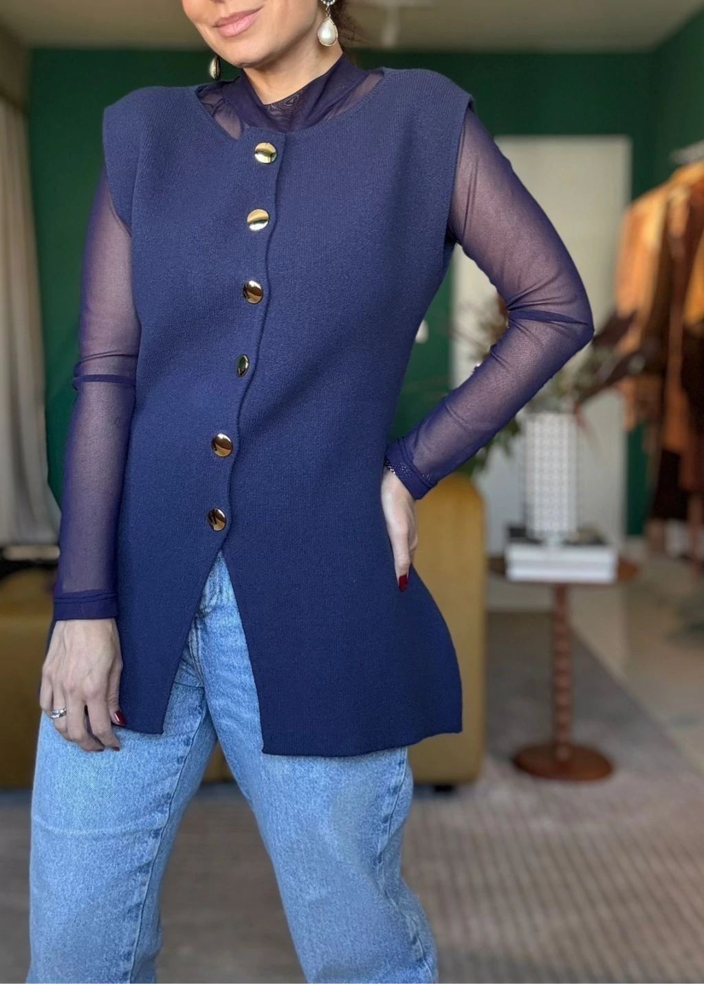 Ideal para sobrepor camisas, blusas de manga longa ou vestidos, o colete alongado é uma excelente escolha para transitar com estilo entre o casual chic e o office look.