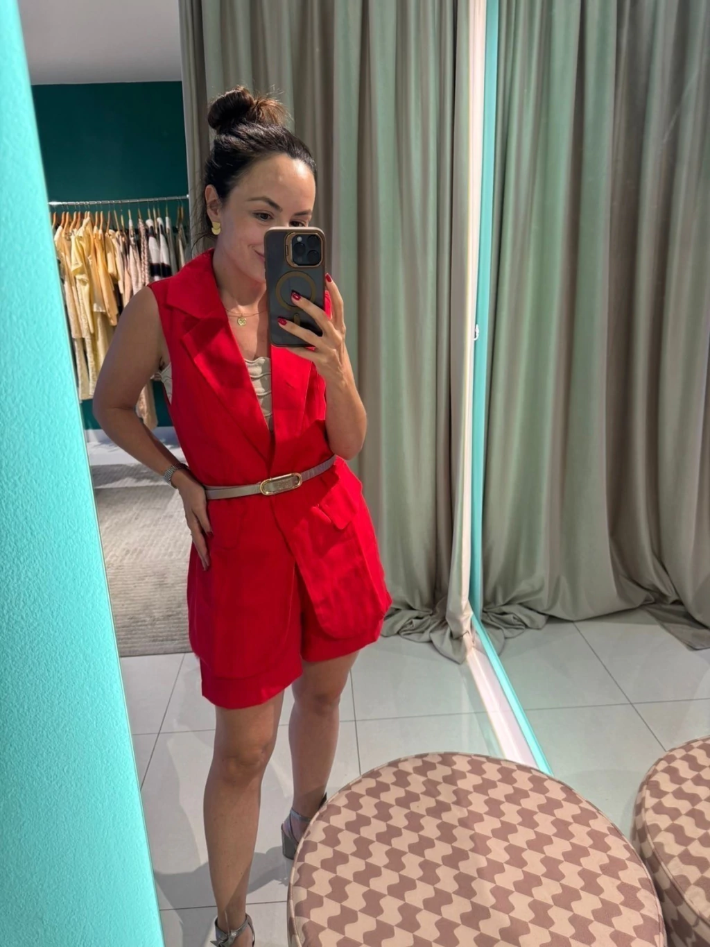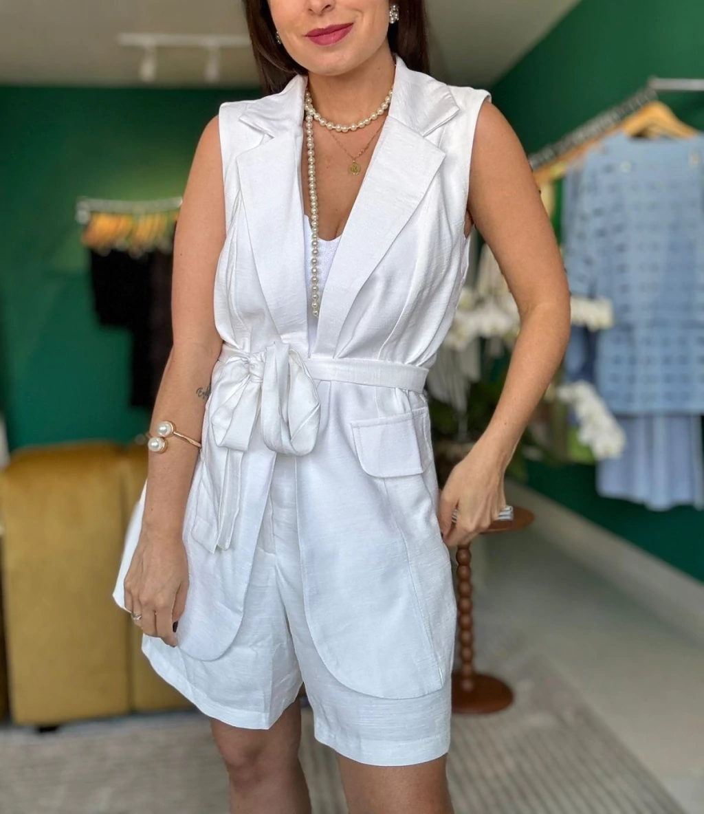 O Conjunto Bela é aquele look que equilibra estilo e conforto com perfeição. Feito em tecido leve com toque sofisticado, ele traz colete alongado com lapelas clássicas, que acompanha faixa para amarração, marcando a cintura de forma elegante. O short possui forro, bolsos funcionais e caimento soltinho, garantindo conforto e zero transparência.