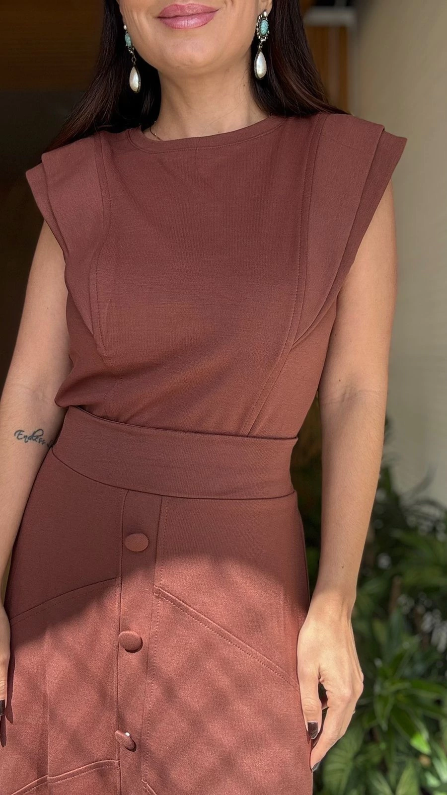A blusa de ombro estruturado traz modernidade ao look, enquanto a saia longa com detalhe de botões frontais e recortes estratégicos proporciona um visual alongado e feminino. Um conjunto perfeito para ocasiões especiais ou para um dia de trabalho elegante.