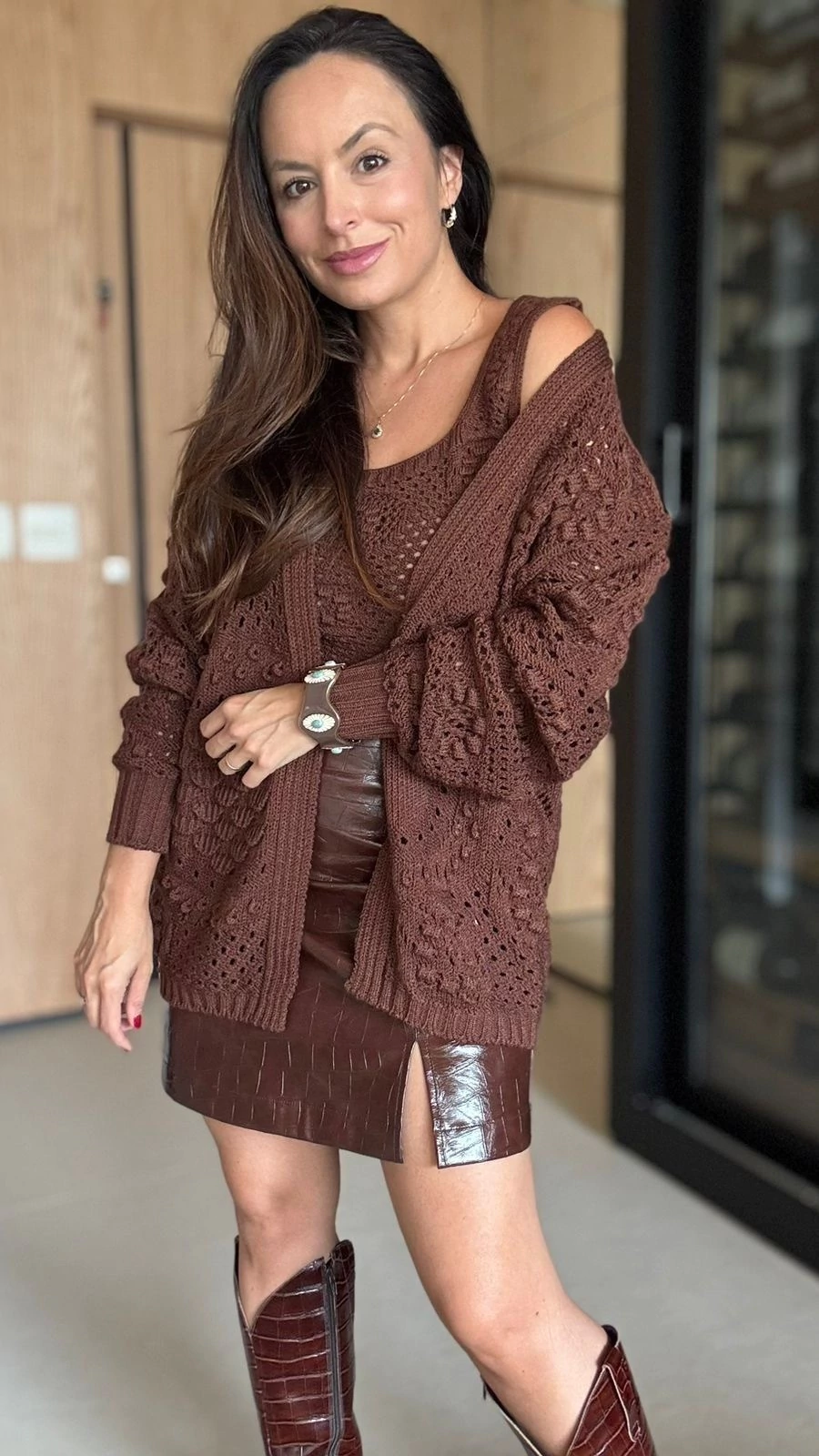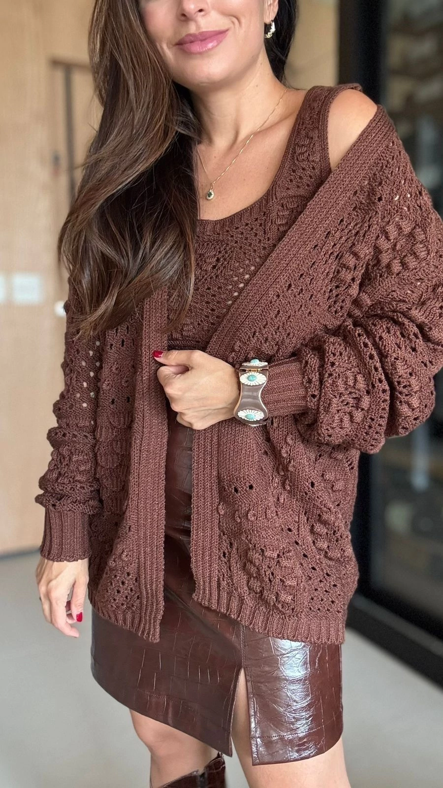 Conjunto composto por duas peças, cropped e cardigan. Ambas as peças em tricot com ponto trabalhado. Cropped com decote reto e alças largas. Cardigan amplo com mangas bufantes e punho ajustado. Modelo veste top por baixo do cropped, pois a peça tem trabalho vazado igual ao cardigan.