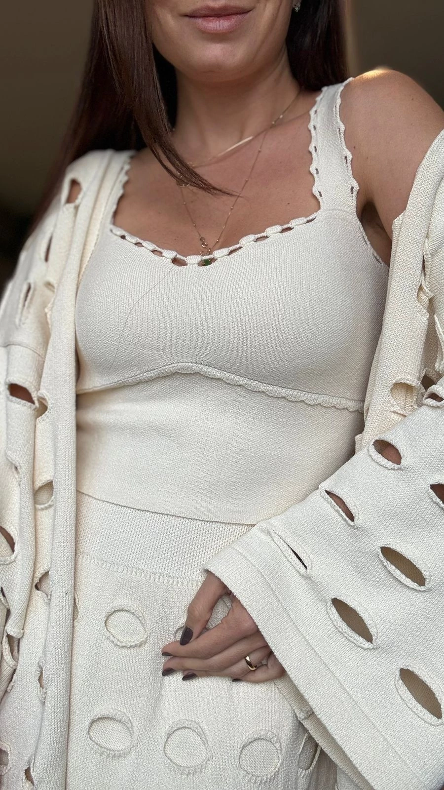Nosso cropped Liliane tem modelagem ajustada que valoriza a silhueta de forma delicada. O detalhe vazado no decote e nas alças adiciona um toque feminino e sofisticado, enquanto o acabamento com borda ondulada traz um ar artesanal exclusivo.