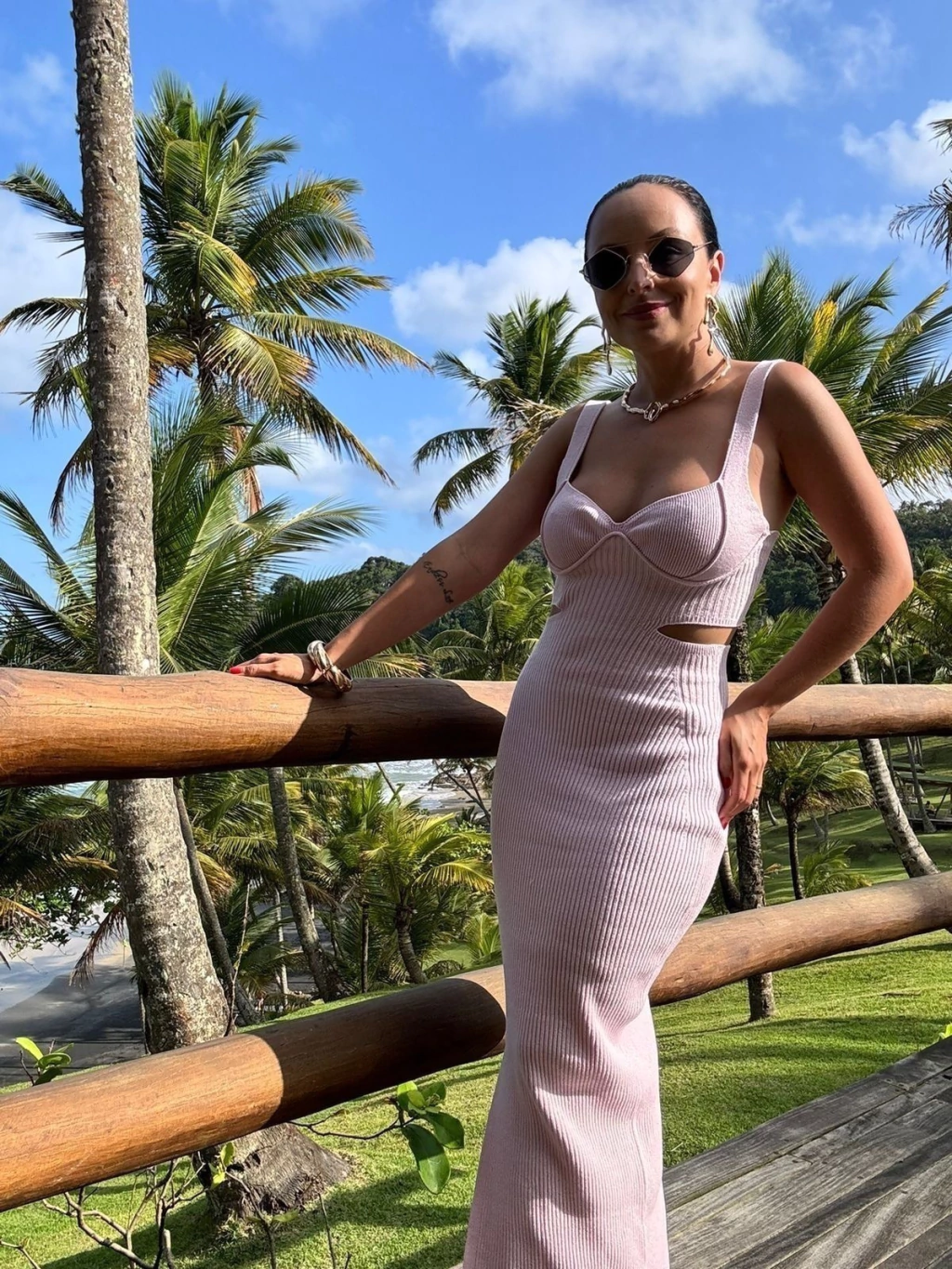 O modelo conta com alças largas e um decote desenhado, proporcionando um toque feminino e sofisticado. Para dar um charme extra, o vestido possui recortes na cintura e uma fenda lateral, que garante um movimento leve e elegante.